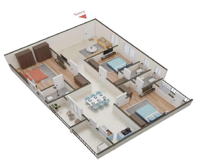 Main Door: Manufactured Teak wood Veneered door frame & shutter finished with good quality melamine polish & hardware of reputed make.