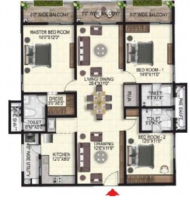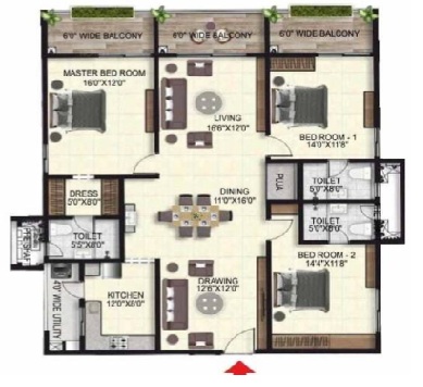 Master bedroom: 800x800 Double charged vitrified tiles.