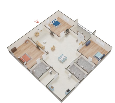 All Bedrooms & Kitchen: 800 x 800 mm size Double charged vitrified tiles of reputed make.