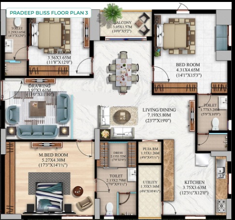 OTHER BED ROOMS: 800 x 800mm size double charged vitrified tiles.