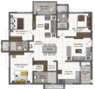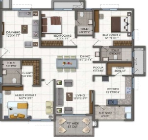 All Bedrooms & Kitchen 800 x 800 mm size Double Charged Vitrified Tiles of Reputed Make with spacer joints