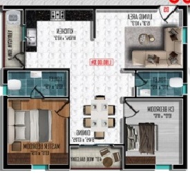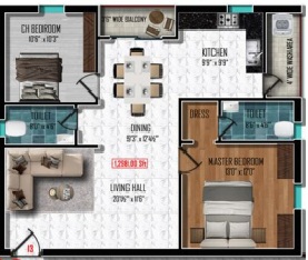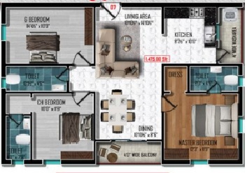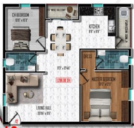 Bedrooms & Kitchen: 800 x 800 mm size double-charged vitrified tiles of reputed make with spacer joints.