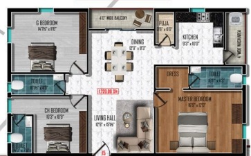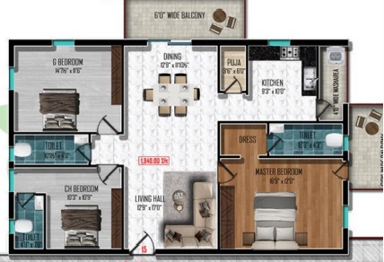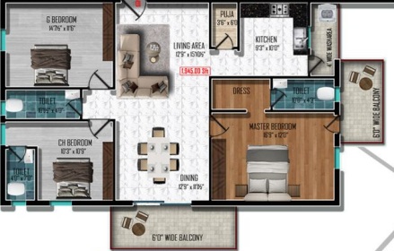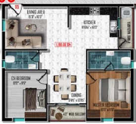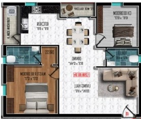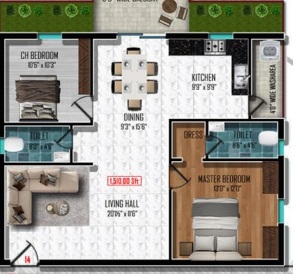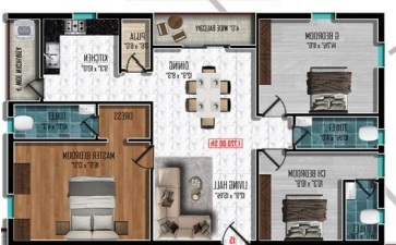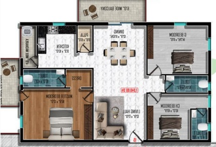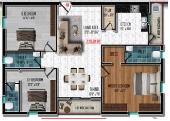 Living & Dining: 800 x 800 mm sized double-charged vitrified tiles of reputed make with spacer joints.