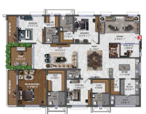 DRAWING ROOM, LIVING, DINING, POOJA ROOM, SUITE ROOMS, DRY KITCHEN