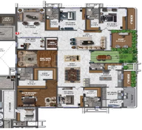 Premium imported Sanitary fittings of Villeroy & Boch, Globo, or equivalent make in all bathrooms. Ultra Premium imported Colored Gold / Black fittings for Bathroom Fixtures of Carimali / Don Bracht / Fantini or equivalent make. Three-way thermostat diverter with spout, rain shower, and a hand shower in all bathrooms. Wall mounted EWC with Flush Valves. Wash basins with Vanities. LED Glass Mirrors in all the washrooms. Rain showers in Master Bed Room & other Suite Rooms. Shower cubicles or glass partitions for WC in all bathrooms.