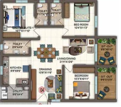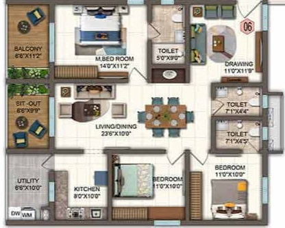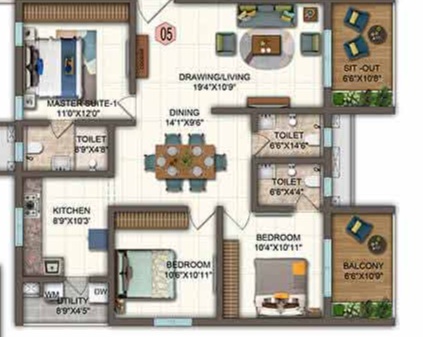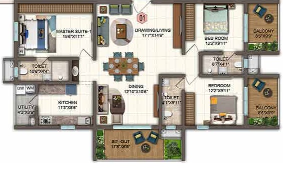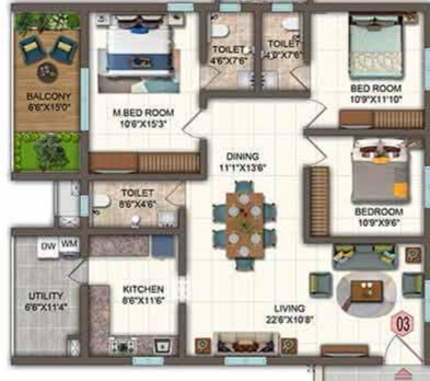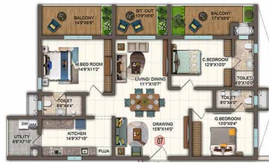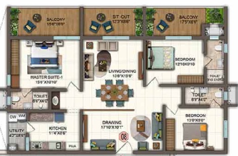 Living/Dining/Kitchen/Bedrooms: 600 x 1200 mm Vitrified tile with double/multi-charge based on the area of laying.