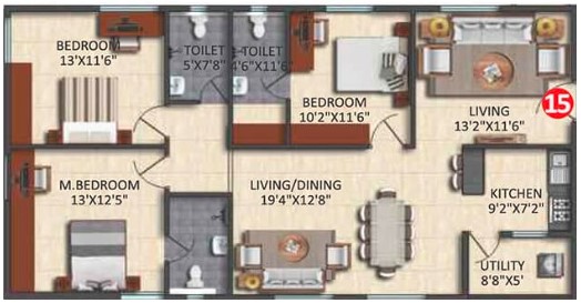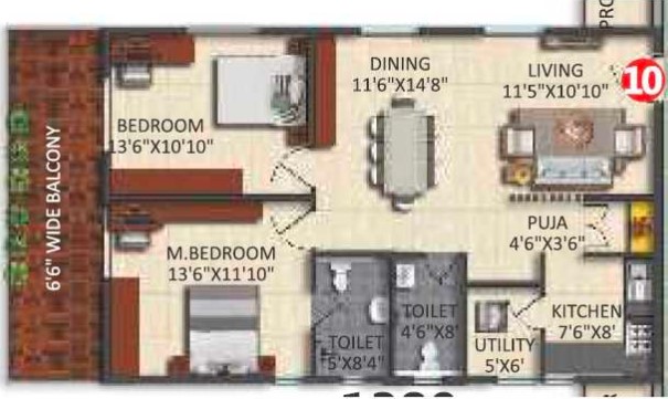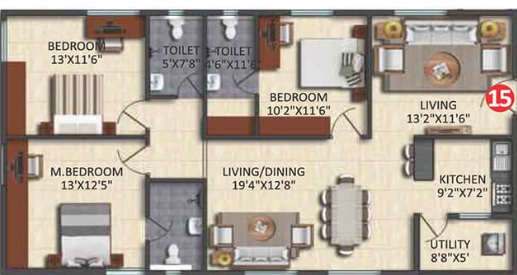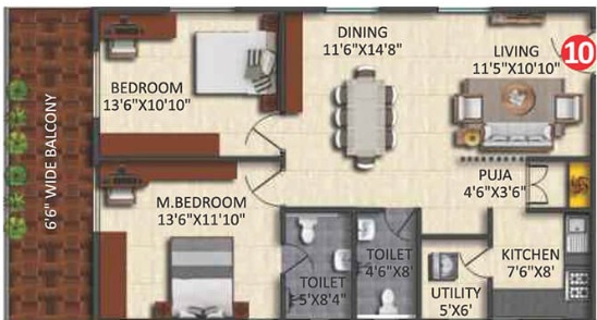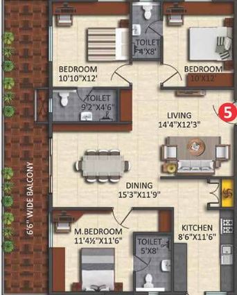 Master Bed Room: 600 X 600 mm Double charged vitrified tiles (upgradable to laminated wooden flooring at a premium)