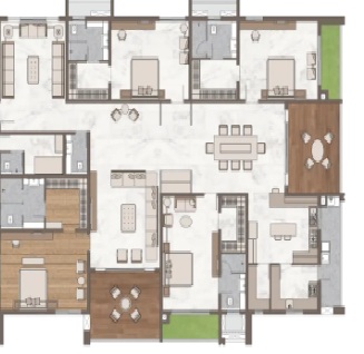 Walls: Premium quality Large Format Tile Cladding up to 4' height, with the remaining wall area finished with Acrylic Emulsion Paint of low VOC.