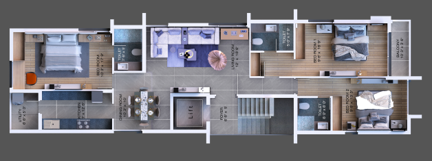 The residential apartment is designed with 3 BHK units, offering comfort and convenient space for accommodation. Everyone in the family gets their individual space in a private way. All the daily necessities lie nearby for easy access.